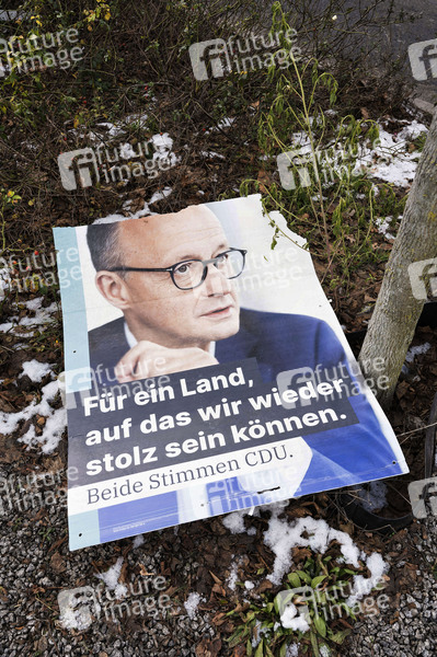 Abgerissenes Wahlplakat zur Bundestagswahl mit Motiv CDU Friedrich Merz. Berlin, 14.01.2025
