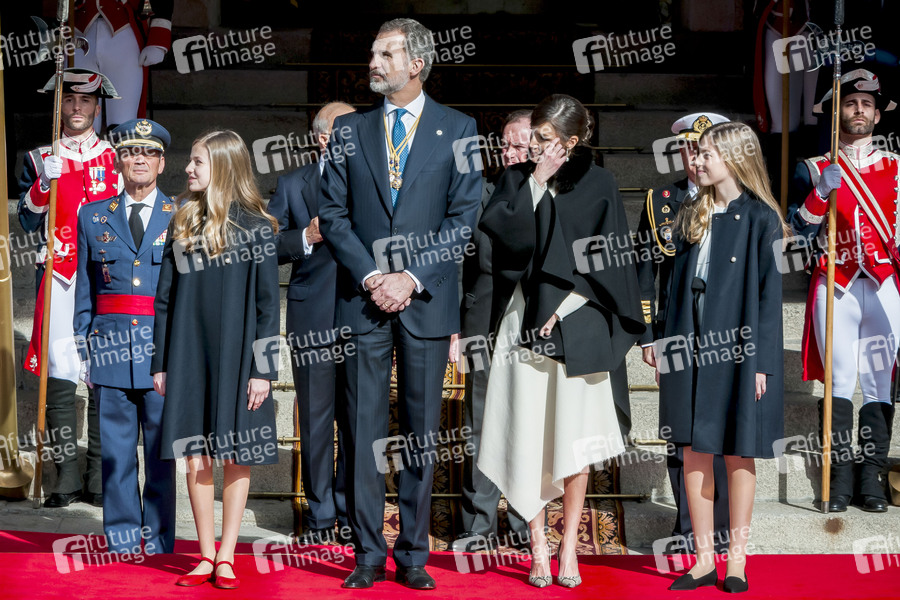 Prinzessin Sofia von Spanien, König Felipe VI. von Spanien, Königin Letizia von Spanien und Prinzessin Leonor von Spanien bei der feierlichen Eröffnung der XIV. Legislatur des Congreso de los Diputados, des Unterhauses des spanischen Parlamentes, vor dem Palacio de las Cortes. Madrid, 03.02.2020