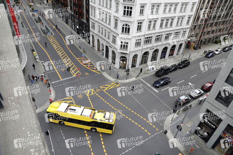 Bis Januar 2021 dürfen zwischen Französischer Straße und Leipziger Straße keine Autos auf der Friedrichstraße fahren - aber Radfahrer. Sie bekommen eine vier Meter breite Spur, die noch grün unterlegt werden soll, sie soll auch als Gasse für Rettungswagen dienen. Es gilt das Tempolimit 20 für Radfahrer. Das Projekt ist Teil des mehrmonatigen Tests 'Flaniermeile Friedrichstraße'. Berlin, 01.09.2020