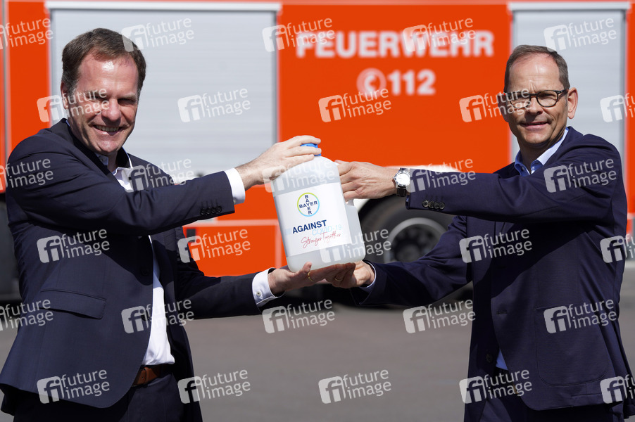 Die Firma Bayer spendet Desinfektionsmittel an die Stadt Köln. Köln-Kalk Stadtdirektor Stephan Keller und Wolfram Sirges von der Bayer AG bei der Übergabe in der Feuerwehrwache Köln-Kalk. Köln, 07.04.2020
