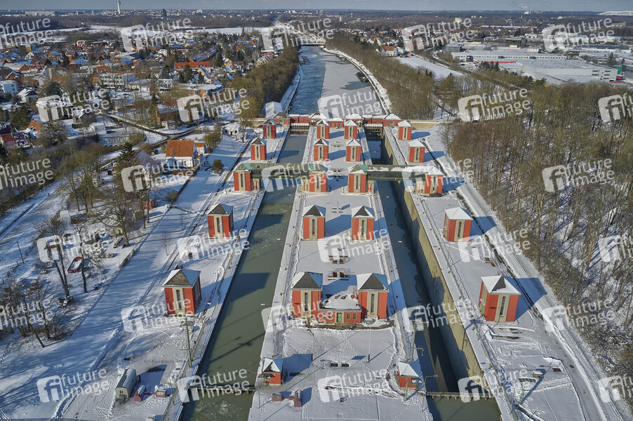 Schleuse Anderten, Wetter, verschneit, Schnee, Glätte, Eis, kalt, Wintereinbruch, Minustemperaturen, Winter, Winterwetter, Grenzwetterlage, Schneefälle, Schneefall, Frost, Wetterlage, Schiffahrt, Binnenschleuse, Kanal, Gewässer, Eisschollen, Drohne, Drohnen, Kameradrohne, Drohnenaufnahme