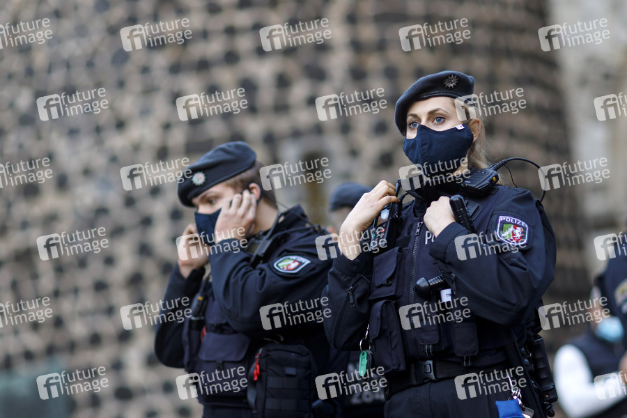 Polizisten müssen im Polizeidienst auf Demos eine Maske tragen - hier auf einer Demonstration gegen die Corona-Maßnahmen von Stadt Köln und Bundesregierung auf dem Rudolfplatz. Köln, 31.10.2020