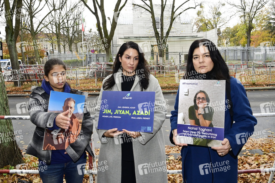 Daniela Sepehri, Minu Barati und Jasmin Tabatabai bei einer Protestaktion vor der Botschaft der Islamischen Republik Iran nach der Hinrichtung des Deutsch-Iraners Jamshid Sharmahd. Berlin, 29.10.2024