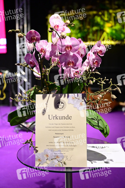Suzanne von Borsody, als Namensgeberin, bei der feierliche Taufe einer neuen Orchideenzüchtung bei der Nacht der Orchideen während der Ostermesse Dresdner Ostern in der Messe Dresden. Dresden, 28.03.2025