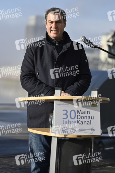 Markus Söder bei der Jubiläumsveranstaltung '30 Jahre Main-Donau-Kanal' am Bamberger Hafen. Bamberg, 25.11.2022