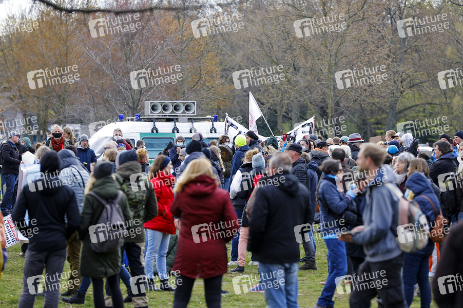 Demonstration von Menschen aus dem Querdenken-Spektrum gegen das neue Infektionsschutzgesetz während der Kabinettssitzung im Bundeskanlzeramt auf der Reichstagswiese. Berlin, 13.04.2021