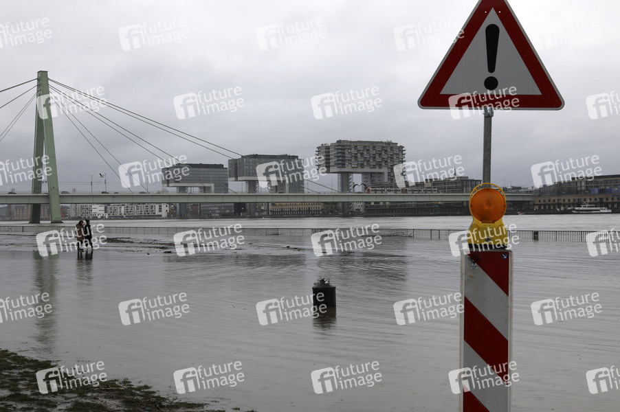 Reinhochwasser, Rheinpegel, Fluss, Rhein, Pegelstand, Pegel, Hochwasser, Pegelmarke, Hochwassermarke, Hochwasserwelle, Scheitelpunkt, Rhein-Pegel, Flussbett, Flut, Schifffahrt, Hochwasserschutz, Wasserstand, Mittelwasser, Tauwetter, Rheinschifffahrt, Rheinufer, Rhein-Ufer, Hochwasserschutzzentrale, Hochwasserwelle, Pegel-Nullpunkt, Hochwasserlage, Hochwassermeldedienst, Hochwasserinformationsdienst, Wasserstände, Pegelstände, Wetterlage, ansteigendes Wasser, steigender Pegel, unter Wasser, überflutet, Rheinufer, Schmelzwasser, Wetter, Scheitelpunkt, kritische Marke, Hochwassermarke, Kranhäuser, Deutz, Symbolbild, Symbolfoto