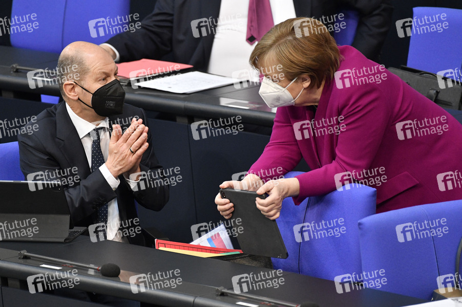 Olaf Scholz und Angela Merkel in der 218. Sitzung des Deutschen Bundestages im Reichstagsgebäude. Berlin, 25.03.2021