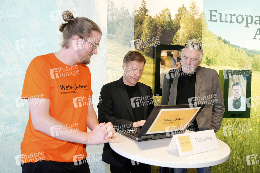 Martin Schirdewan am Wahl-O-Mat zur Europawahl mit Wahlprogrammen der politischen Parteien mit Vertretern der Parteien im Europäischen Haus. Berlin, 07.05.2024