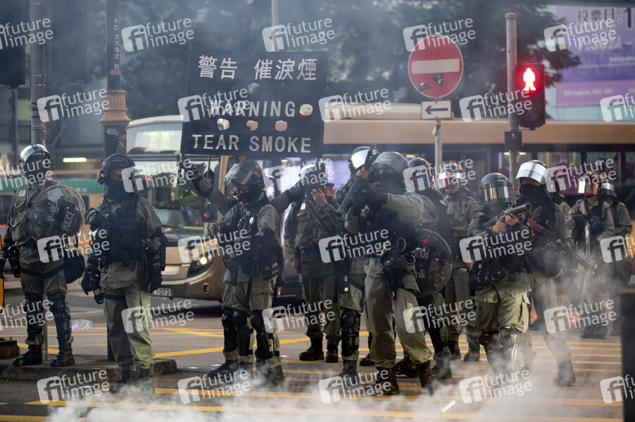 Polizei setzt Tränengas ein im Tsuen Wan Bezirk. Sonntagskämpfe zwischen Demonstranten und Polizei finden in und um Einkaufszentren in verschiedenen Stadtteilen statt. Es ist der fünfte Monat in Folge, seitdem in Hongkong die Proteste andauern, die durch ein nun zurückgezogenes Auslieferungsgesetz ausgelöst wurden. Dieser Protest hat sich jedoch zu einer breiteren Forderung nach demokratischen Reformen und unabhängigen polizeilichen Ermittlungen sowie zu anderen Forderungen entwickelt. Carrie Lam erlies ein Verbot der Gesichtsbedeckung mit Wirkung zum 5. Oktober. Bürger versammeln sich in verschiedenen Einkaufszentren und Stadtteilen, um zu protestieren. Hongkong, 10.11.2019