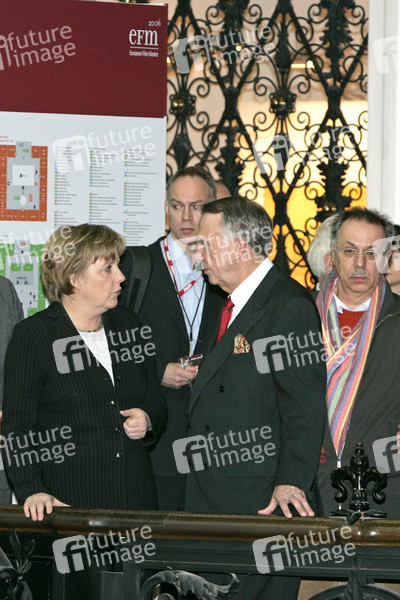 Angela Merkel (Bundeskanzlerin), Bernd Neumann (Staatsminister für Kultur und Medien) und Dieter Kosslick (Festivaldirektor) bei der Eröffnung des European Film Markets auf der Berlinale 2006 / 56. Internationale Filmfestspiele Berlin. Berlin, 10.02.2006