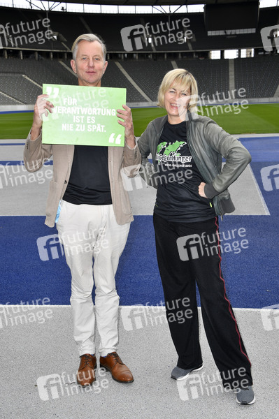 Max Raabe und Gesine Cukrowski beim Fototermin zur sportichen '#WocheChallenge' im Olympiastation Berlin. Unter dem Motto 'Wir können was bewegen!' ruft die Welthungerhilfe zu dieser Challenge auf und bittet um Spenden für eine Welt ohne Hunger. Berlin, 09.10.2020