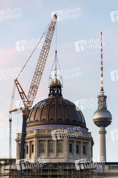 Architektur, Attraktion, Aufsetzung, Baustelle, Bauwerke, Berliner Stadtschloss, Christentum, Fertigstellung, Geschichte, Inschrift, Kolonialismus, Kran, Kreuz, Kultur, Kunst, Kuppel, Kuppelkreuz, Kuppellaterne, Laterne, Monarchie, Montage, Museen, Museum, Rekonstruktion, Religion, Restitution, Schloss, Sehenswürdigkeiten, Sightseeing, Stadtschloss, Wiederaufbau