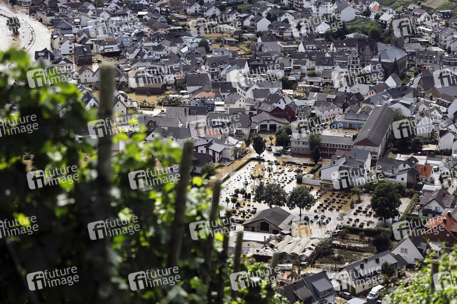 In der Eifel haben heftige Regenfälle und Dauerregen für Überschwemmungen und Überflutungen gesorgt. Im Ahrtal trat der Fluss vielerorts über die Ufer und überschwemmte nicht nur Keller sondern ganze Ortschaften. Im Bild der Ort Dernau (Landkreis Ahrweiler), der beinahe komplett von den Wassermassen geflutet wurde. Viele Menschen verloren alles. Dernau, 15.07.2021