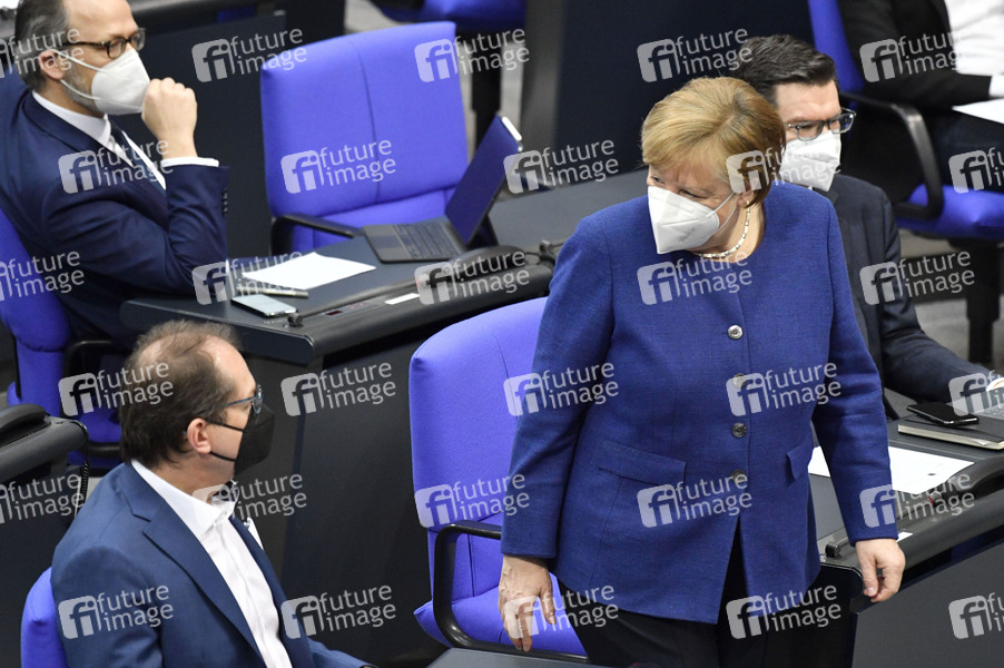 Alexander Dobrindt und Angela Merkel in der 212. Sitzung des Deutschen Bundestages im Reichstagsgebäude. Berlin, 25.02.2021