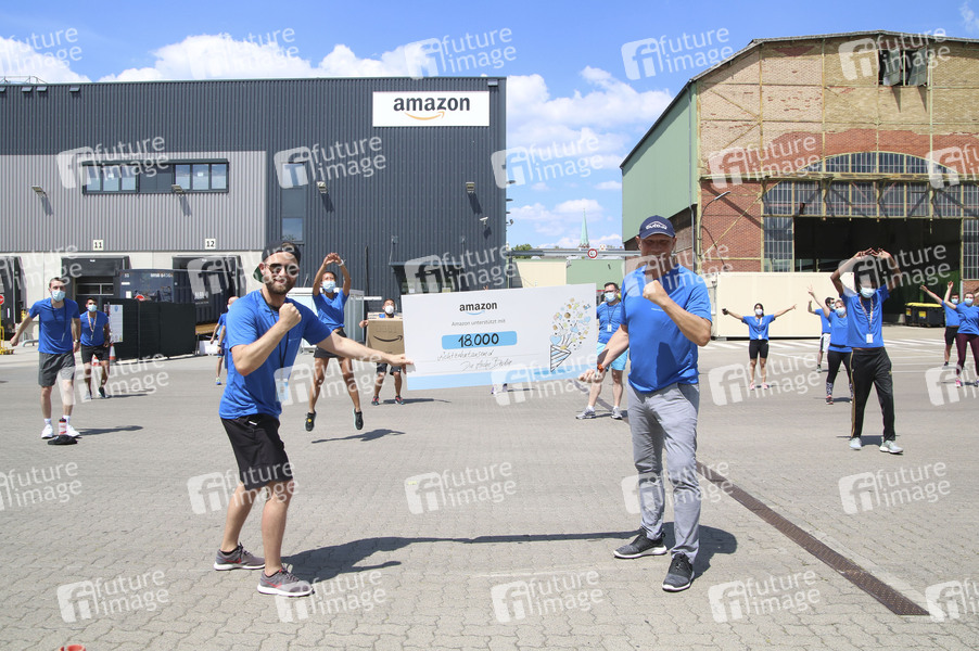 Tim Stapf und Axel Schulz bei Scheckübergabe von Amazon an die Arche. Zahlreiche Mitarbeiter aus vier Amazon Verteilzentren in Berlin/Brandenburg laufen eine Woche lang gemeinsam für den guten Zweck. Für jeden gelaufenen Kilometer spendet Amazon einen Euro an die Arche, um damit die nachhaltige Arbeit zugunsten benachteiligter Kinder und Jugendlicher zu fördern. Bei der Charity-Aktion wird diesmal mit einer Spendensumme in Höhe von insgesamt 18.000 Euro gerechnet. Vor dem finalen Lauf am Borsigturm in Berlin-Tegel gibt Boxlegende Axel Schulz den Läufern und Läuferinnen Tipps aus seiner Erfahrung als Sportler und nimmt von Amazon-Standortleiter Tim Stapf den Spendenscheck für die Arche entgegennehmen. Berlin, 11.06.2021