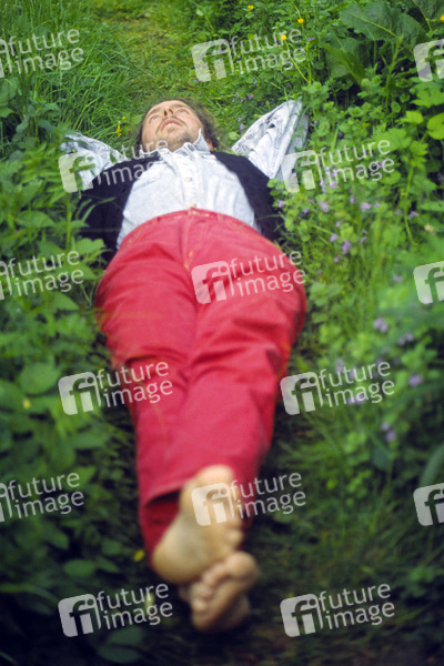 Mann, Juengling, Fruehling, entspannt, Entspannung, sinnend, Sinnsuche, nachdenkend, nachdenken, Stille, Wellness, Genuss, geniessen, Gras, Wiese, Fruehlingsblumen, rote Hose, Single