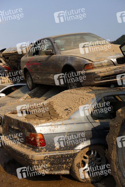 Nach dem Jahrhunderthochwasser in der Eifel durch heftige Regenfälle und Dauerregen mit Überschwemmungen und Überflutungen haben die Aufräumarbeiten im Ahrtal begonnen. Einheiten von Polizei, THW, Bundeswehr und Feuerwehr mitsamt vielen freiwilligen Helfern räumen Straßen, entfernen Schutt und Schlamm und versorgen die Menschen. Im Bild zerstörte Autos in der Ortschaft Dernau, in der die Flut viele Häuser zerstörte, 22.07.2021