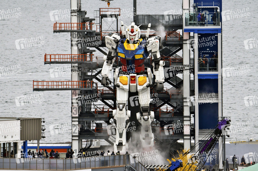 Der 19 Meter großer Modell-Roboter RX-78-2 Gundam aus der Animationsserie 'Kido Senshi Gundam / Mobile Suit Gundam' bei der Eröffnung der Gundam Factory Yokohama am Yamashita Pier. Der Roboter im Originalmaßstab kann insgesamt 24 Gelenke bewegen. Jede halbe Stunde nimmt er eine andere Pose ein und abends wird er beleuchtet. Yokohama, 19.12.2020