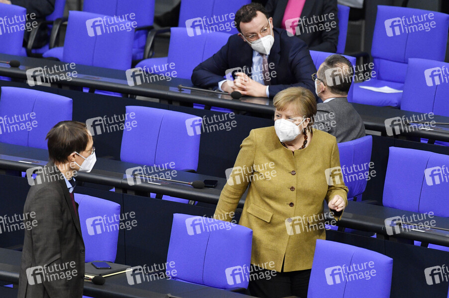 Karl Lauterbach, Jens Spahn, Heiko Maas und Angela Merkel in der 209. Sitzung des Deutschen Bundestages im Reichstagsgebäude. Berlin, 11.02.2021