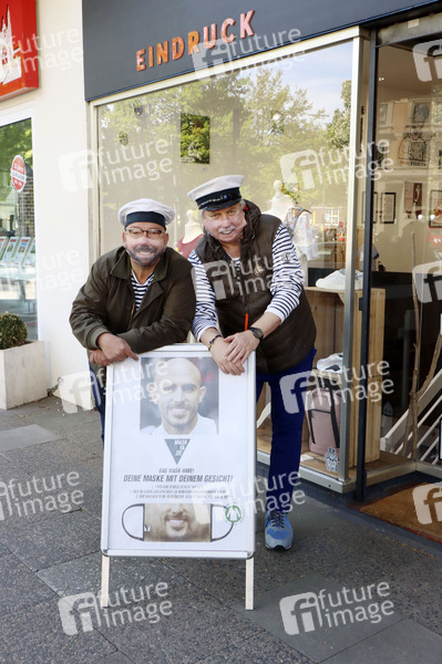 Claas Vogt und Klaus Baumgart von Klaus & Klaus beim Fototermin vor der Textildruckerei EINDRUCK, welche Mund-Nase-Masken mit dem echten Lächeln der Träger herstellt. Hamburg, 06.05.2020