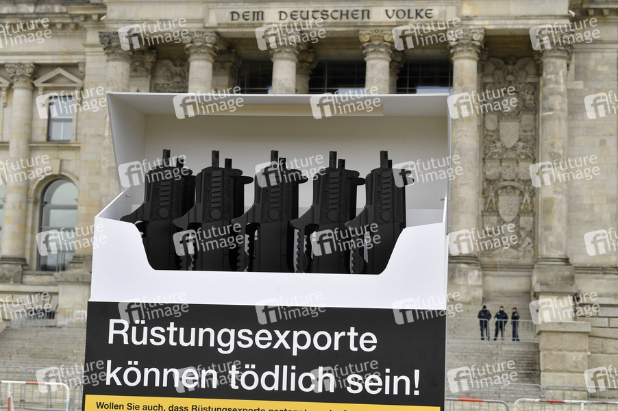 Aktionstag 'Aktion aufschrei' mit einer Kunst- und Protestaktion 'Rüstungsexporte können tödlich sein. Deutschland braucht endlich ein Rüstungsexportkontrollgesetz' vor dem Reichstagsgebäude. Berlin, 26.02.2021