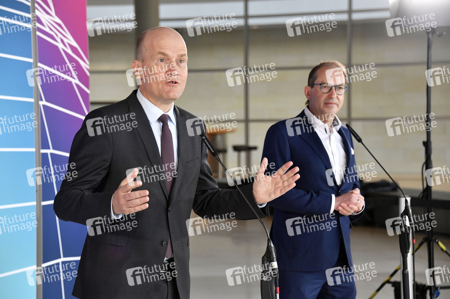 Ralph Brinkhaus und Alexander Dobrindt bei einem Pressestatement der CDU/CSU-Bundestagsfraktion vor der Fraktionssitzung auf der Fraktionsebene im Reichstagsgebäude. Berlin, 13.04.2021