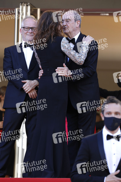 Thierry Fremaux, Isabelle Huppert und Pierre Lescure bei der Premiere des Kinofilms 'Aline / The Voice of Love' auf dem Festival de Cannes 2021 / 74. Internationale Filmfestspiele von Cannes im Palais des Festivals. Cannes, 13.07.2021