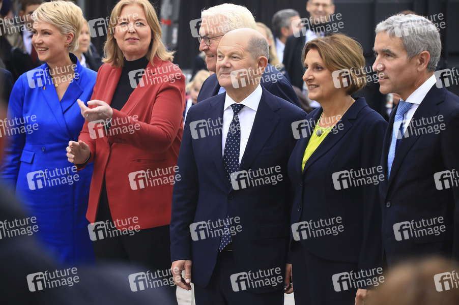 Manuela Schwesig, Bärbel Bas, Frank-Walter Steinmeier, Olaf Scholz, Britta Ernst und Stephan Harbarth beim Festakt zum 34. Jahrestag der Deutschen Einheit im Mecklenburgischen Staatstheater. Schwerin, 03.10.2024
