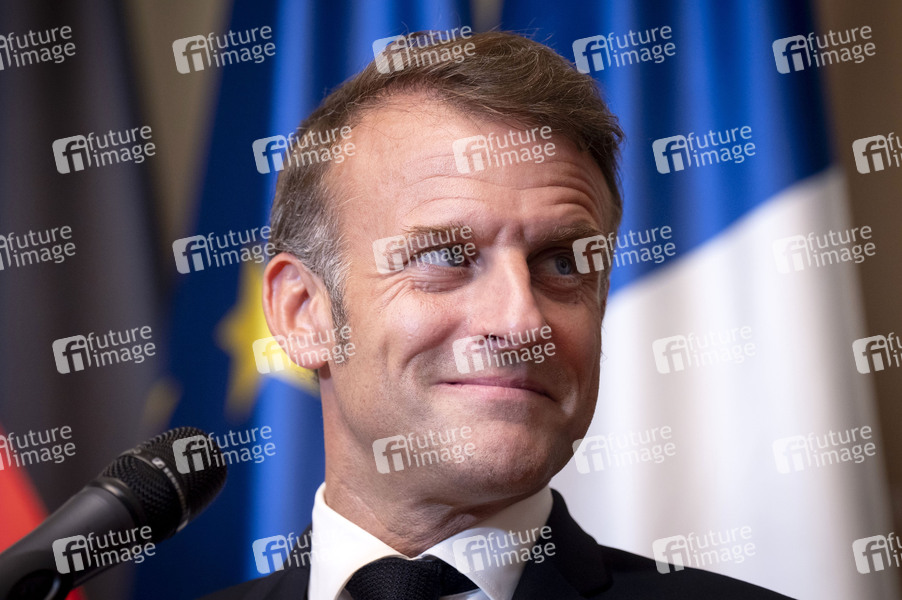 Emmanuel Macron beim Empfang des französischen Staatspräsidenten zu einem gemeinsamen Gespräch mit dem Bundeskanzler mit anschließendem Pressestatement in der Borsig-Villa am Tegeler See. Berlin, 23.07.2025