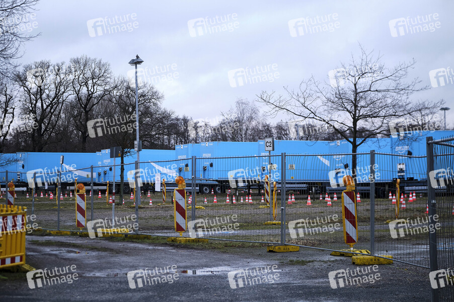 Zahlreiche Amazon-Trailer am Flughafen-Gelände - Kaum Flüge, wenige Passagiere, geschlossene Schalter und vorweihnachtliche Leere während des 2. Lockdowns am Hannover Airport. Langenhagen, 22.12.2020