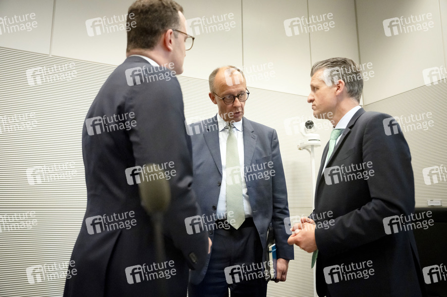 Jens Spahn, Friedrich Merz und Thorsten Frei bei der Fraktionssitzung der CDU/CSU-Bundestagsfraktion im Reichstagsgebäude. Berlin, 03.06.2025