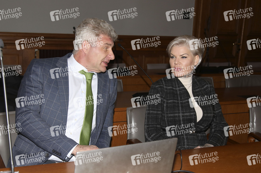 Melanie Müller mit ihrem Anwalt Adrian Stahl beim Berufungsprozess wegen Verwendens von Kennzeichen verfassungswidriger und terroristischer Organisationen im Amtsgericht Leipzig. Leipzig, 18.12.2025