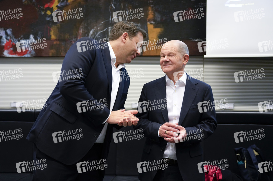 Lars Klingbeil und Olaf Scholz bei der Fraktionssitzung der SPD-Bundestagsfraktion nach dem Ampel-Aus im Reichstagsgebäude. Berlin, 06.11.2024