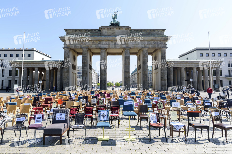 Mit leeren Stühlen vor dem Brandenburger Tor in Berlin protestieren Gastronomen, Veranstalter und Hoteliers gegen die unzureichende Corona-Hilfe. Sie fordern Aufstockung des Kurzarbeitergeldes auf 90%, 7% Mehrwertsteuer, Erweiterung des Bundeszuschusses 'Soforthilfe' für Unternehmen mit mehr als 10 Mitarbeitern und eine klare Exit-Strategie. Berlin, 24.04.2020