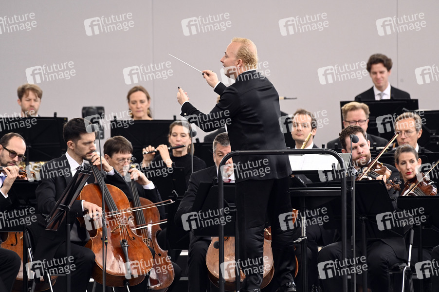 Berliner Philharmoniker beim Staatsakt zu 75 Jahre Grundgesetz auf dem Forum zwischen Bundestag und Kanzleramt. Berlin, 23.05.2024