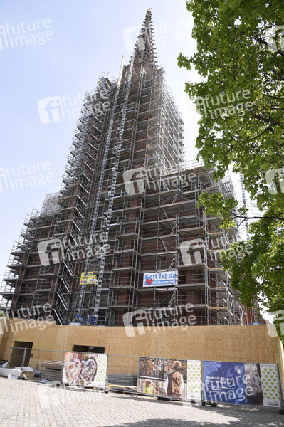 Aufhängen symbolischer Banner zur Absage des Maidult am Bauzaun der Mariahilfkirche und Übergabe von Gutscheinen 'Dult ist Kult!' auf dem Mariahilfplatz. München, 24.04.2020