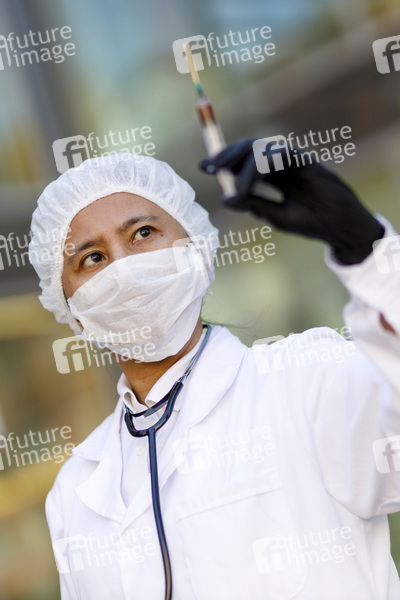 Eine Virologin posiert mit einer Spritze zur Impfung gegen das Corona-Virus. (Symbolfoto mit Model) Nürnberg, 23.04.2020