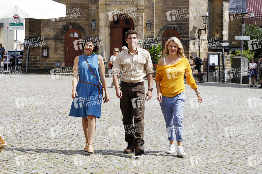 Liza Tzschirner, Philipp Danne und Eva-Maria Grein von Friedl am Set des ARD-Fernsehfilms 'Der Ranger - Paradies Heimat' auf dem Marktplatz. Stadt Wehlen, 14.08.2019