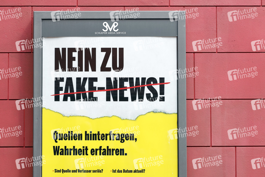 Ein fiktives Plakat gegen Fake News hängt in einer Filmkulisse der MMC Studios in Ossendorf. (Themenbild, Symbolbild) Köln, 19.09.2021