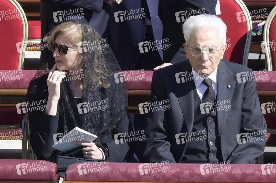 Sergio Mattarella mit Tochter Laura Mattarella bei der Trauermesse für den verstorbenen Papst Franziskus auf dem Petersplatz. Vatikanstadt, 26.04.2025