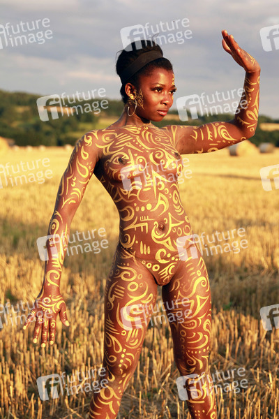 Bodypainting, Erotik, Frau, Mädchen, Afrikanerien, nackt, draußen, weiblich, Körperkunst, Kunst, Ornamente, Malerei, Feld, Acker, Stoppelfeld, Heuballen, Stroh, Landwirtschaft, Ernte, Abendsonne, erotic, African woman, girl, nude, outdoor, female, body art, body painting, ornaments, field, hay, straw, farming, harvest, evening sun
