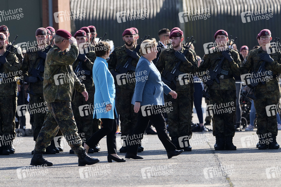 General Eberhard Zorn, Bundeskanzlerin Angela Merkel und Verteidigungsministerin Annegret Kramp-Karrenbauer bei einem Appell für die Soldatinnen und Soldaten der Evakuierungsmission in Kabul und dem Feierlichen Gelöbnis von Rekruten des Fallschirmjägerregiments 31 in der Fallschirmjägerkaserne Seedorf. Seedorf, 22.09.2021