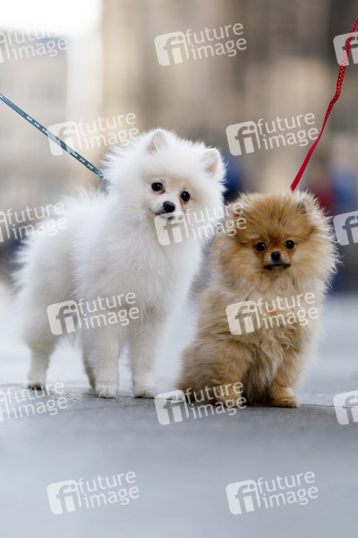 Zwei Spitz Welpen werden an Leinen ausgeführt auf der Domplatte. Köln, 18.03.2020