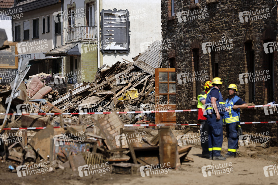 Nach dem Jahrhunderthochwasser in der Eifel durch heftige Regenfälle und Dauerregen mit Überschwemmungen und Überflutungen haben die Aufräumarbeiten im Ahrtal begonnen. Einheiten von Polizei, THW, Bundeswehr und Feuerwehr mitsamt vielen freiwilligen Helfern räumen Straßen, entfernen Schutt und Schlamm und versorgen die Menschen. Im Bild zerstörte Häuser in der Ortschaft Altenahr, in der die Flut viele Häuser zerstörte, 22.07.2021