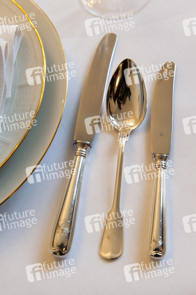 seit 1950 Amts- und Wohnsitz des Bundespräsidenten der Bundesrepublik Deutschland, seit 1994 Zweitwohnsitz, Regierungsgebäude, Bauwerk, Besteck, Geschirr, Tisch, Gedeck