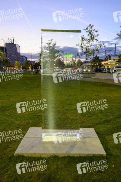 Kunstwerk 'Rolihlahla' (Unruhestifter) auf dem Nelson-Mandela-Platz. Ein Rohdiamant, der in einer durchsichtigen Acrylglasstele schwebt. Aus der Ferne kaum sichtbar, funkelt der Edelstein von Nahem im Licht. Das Künstlerinnenduo missing icons benannte ihr Kunstwerk nach Nelson Mandelas erstem Vornamen. Nürnberg, 14.10.2021