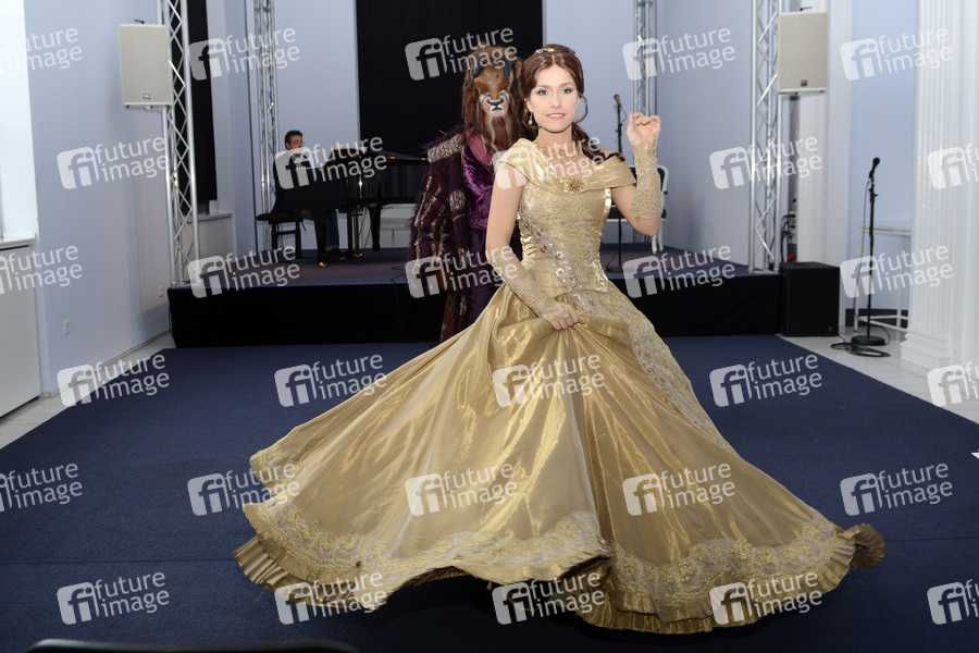 Kitti Jenes (Belle) und Sandor Barkoczi (Biest) bei der Präsentation des Disney Musicals 'Die Schöne und das Biest' im Opernhaus. Hannover, 28.05.2014