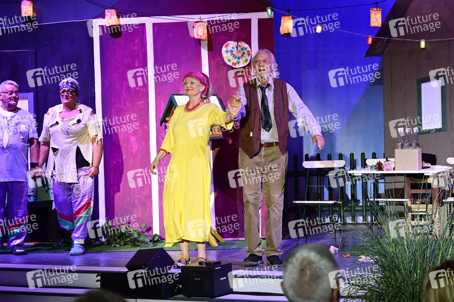 Rita Feldmeier und Achim Wolff bei der Premiere des Theaterstücks 'Maxe Baumann - Ferien ohne Ende' während der Beelitzer Festspiele 2025 auf der Freilichtbühne. Beelitz, 14.08.2025