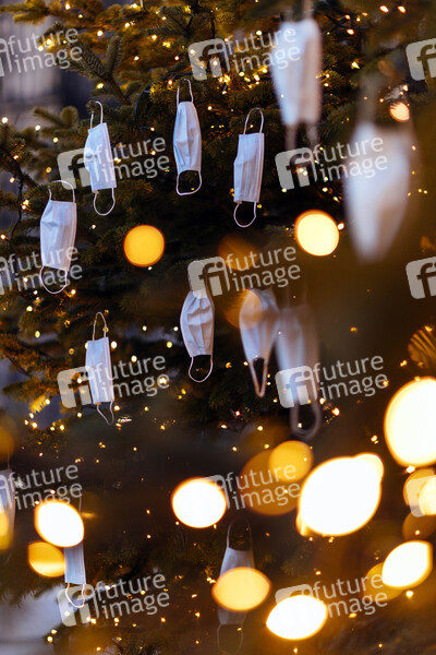 Gesichtsmasken hängen an den Weihnachtsbäumen auf dem Roncalliplatz. Normalerweise wird der Platz als Standort für einen der umsatzstärksten Weihnachtsmärkte der Region genutzt. Aufgrund der Corona-Pandemie wurde dieser ersatzlos gestrichen. (Themenbild, Symbolbild) Köln, 11.12.2020